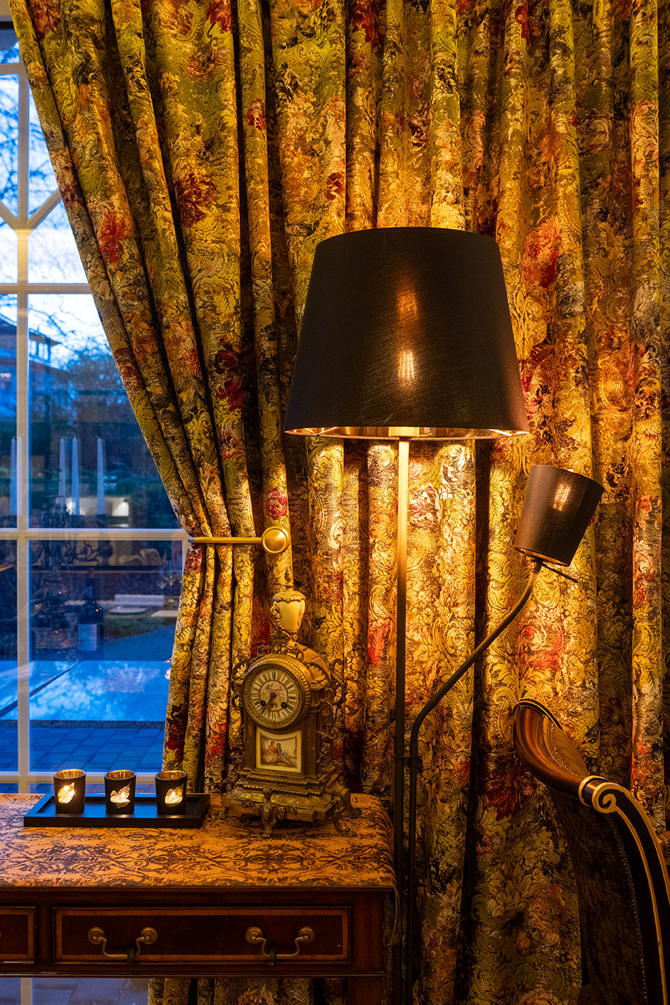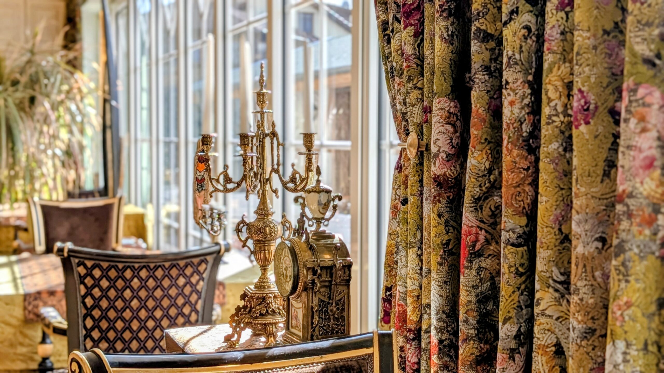 Der lichtdurchflutete Gastraum – direkt am Schlossteich gelegen – empfängt seine Gäste wie in einem der großen Salons europäischer Residenzen. Deckenhohe Fenster, florale Breetz-Stoffe, antike Kandelaber, kunstvoll handbemalte Decken und Wände sowie ein warmes Licht schaffen eine Atmosphäre von zeitloser Noblesse. Zwischen klassischer Opulenz und wohltuender Ruhe entfaltet sich ein Rahmen, der dem kulinarischen Anspruch des Hauses gerecht wird: genussvoll, kultiviert und bis ins Detail komponiert.